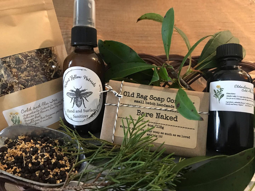 Looking to fend off the cold season? Try our Be Well Basket with local hand sanitizer, soap, cold and flu herbal tea and elixir.